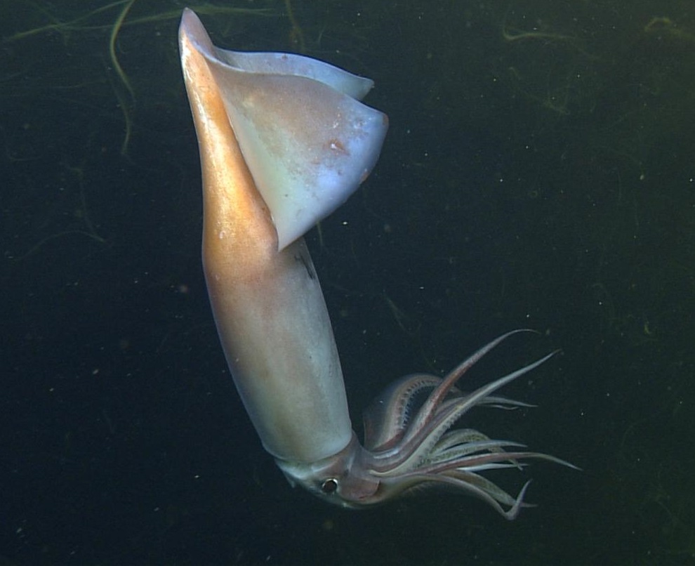 A Humboldt squid shows its colors in the lights of a remotely operated vehicle 300 meters below the surface of Monterey Bay. Copyright 2010 MBARI